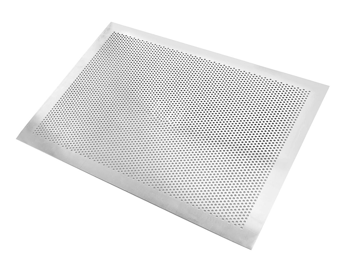 Perforovaný hliníkový pečicí plech 40X30 cm. Kvalitní perforovaný pečicí plech z hliníku zajišťuje díky perforaci rovnoměrné proudění horkého vzduchu a tím i perfektní propečení těst, sušenek, pizzy, odpalovaného těsta a taky tartaletek. Plech je dokonale rovný a vhodný i pro použití cukrářských ráfků až do průměru 28 cm.